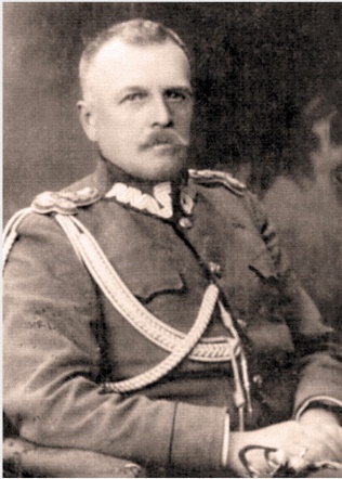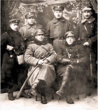 Dowództwo ochotniczego konnego oddziału Samoobrony Ziemi Wileńskiej braci Dąbrowskich, luty 1919 r. Od lewej siedzą: mjr Władysław Dąbrowski i rtm. Jerzy Dąbrowski („Łupaszko”)