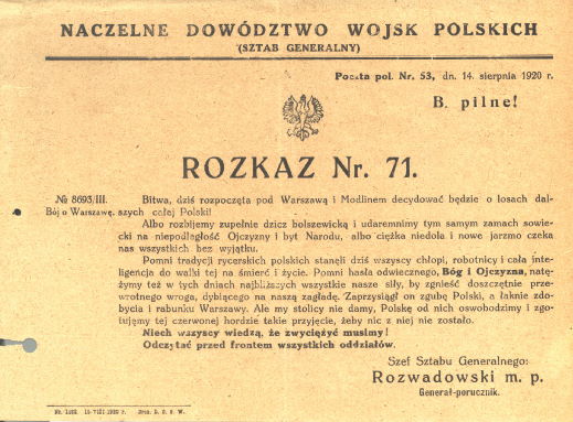 „Rozkaz Nr. 71” szefa Sztabu Generalnego Wojska Polskiego gen. Tadeusza Jordana Rozwadowskiego, Warszawa, 14 sierpnia 1920 r.