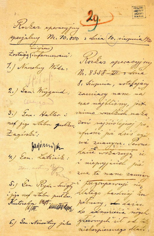 Własnoręcznie spisany przez gen. Tadeusza Jordana Rozwadowskiego w nocy z 8 na 9 sierpnia 1920 r. „Rozkaz operacyjny specjalny Nr. 10 000” był ostateczną modyfikacją planu Bitwy Warszawskiej
